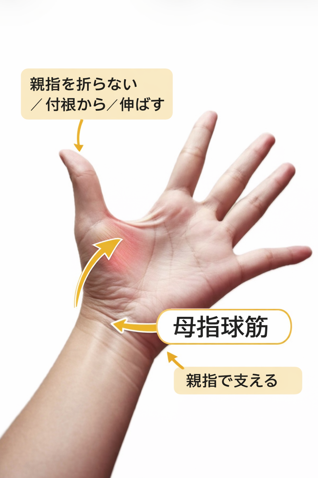 親指には母指球筋と呼ばれる、親指専用の筋肉群がある。ここが本来の働きをすると、手のひらに安定した土台が生まれる。しかし、この筋肉が弱ったり使われない状態が続くと、親指の関節に負担が集中しやすくなり、その影響は手首や前腕、さらには肩にまで及びます。